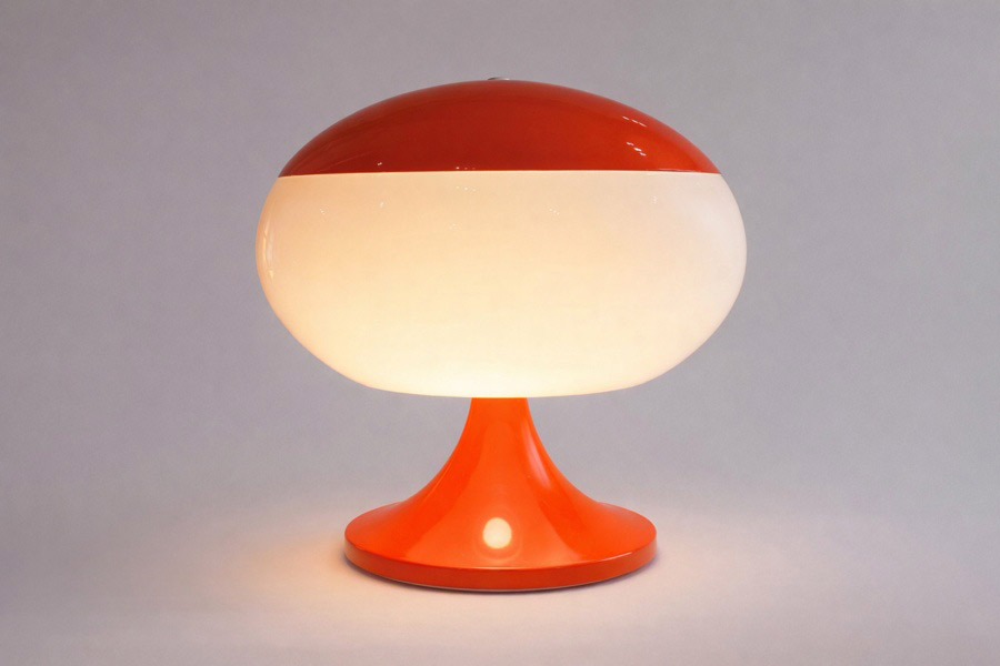 Este modelo presenta el icónico diseño tipo “mushroom lamp”, con silueta orgánica y proporciones equilibradas que evocan la estética futurista característica del diseño italiano de la época. Realizada con base en material acrílico moldeado y difusor en vidrio opalino, combina un tono naranja vibrante con blanco opalino, generando una luz suave y envolvente.