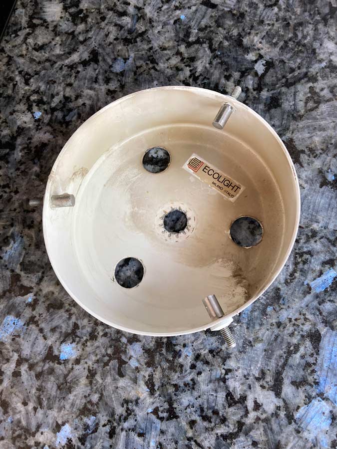La etiqueta original en su interior confirma su autenticidad como pieza Ecolight Milano, lo que refuerza su valor como objeto de colección dentro del diseño europeo de mediados del siglo XX.